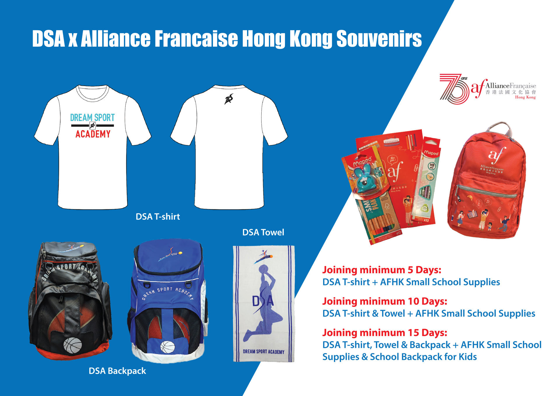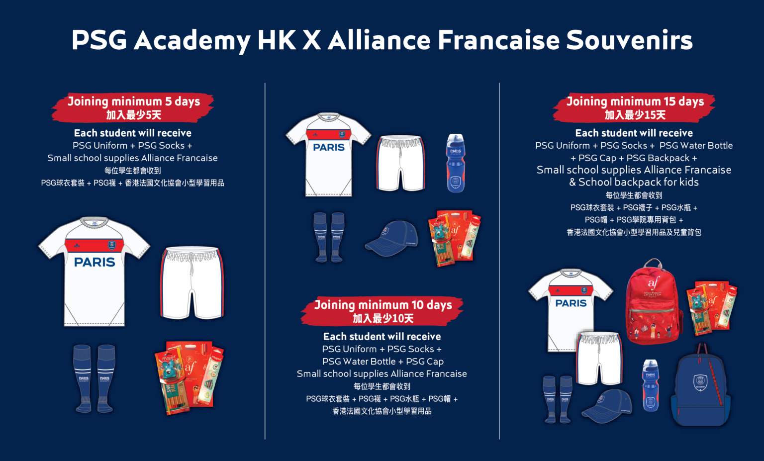 把握機會參加香港備受期待的夏季運動及教育營! 成為第一批註冊的學員,將會是球員難得的精彩的體驗。參加巴黎聖日耳門學院香港 PSG 的頂級足球訓練及DSA 夢幻教室的籃球訓練,他們亦可以由高素質的法藉老師教授的法語課程中學習。