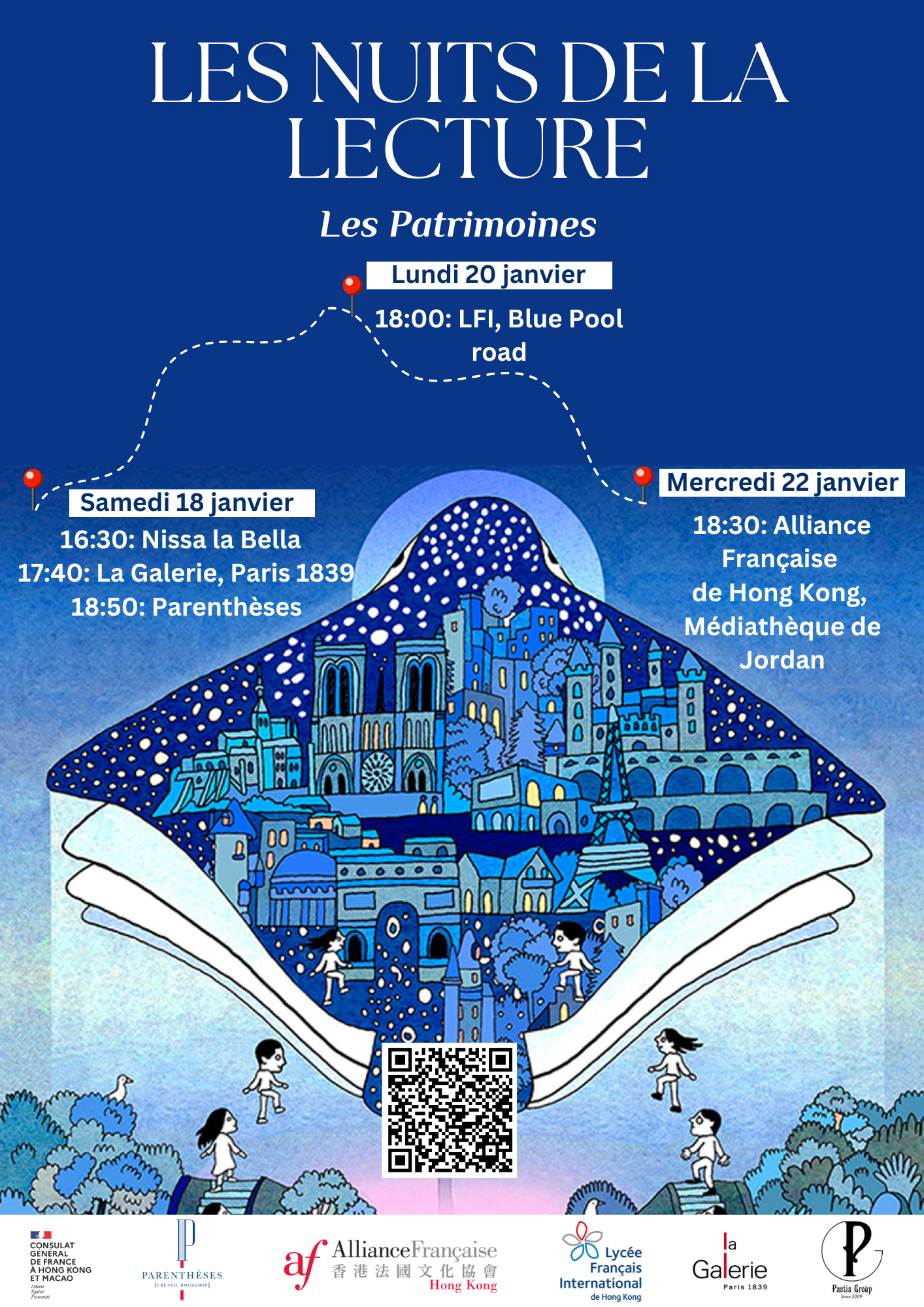 「閱讀之夜」由法國領事館、Parenthèses、法國國際學校及法國文化協會聯合舉辦,將於2025年1月18日至22日期間舉行。公眾獲邀參與以文化遺產為主題的閱讀活動,重點探討個人及集體遺產。文學豐富了文化遺產,而當代作家則為明日的文化遺產作出貢獻。活動將在多個著名文化遺產場地舉行聚會及閱讀會。美酒佳餚伴您同享:特備精選芝士拼盤及紅酒!