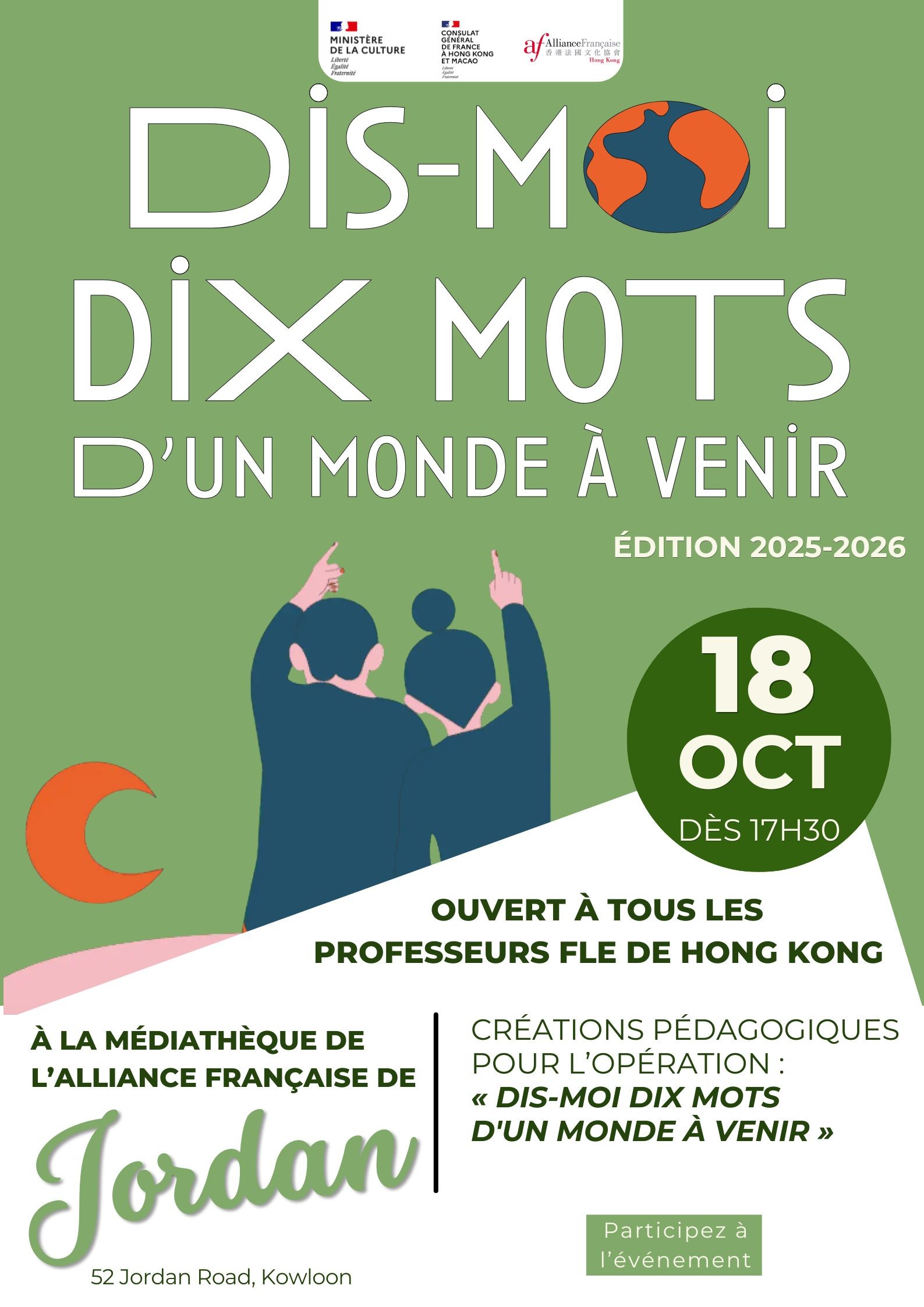 L'Alliance Francaise de Hong-Kong et le Consulat de France à Hong-Kong et Macao vous propose le 18 octobre prochain un atelier de création pédagogiqe autour de l'opération « Dis-moi dix mots » animé par Benoit Manas .
